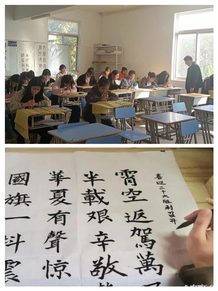 学校明德书法社以“学习二十大”为主题进行了书法练习。社员们临习书帖,静心静气,一个个坐姿端正,手握毛笔正聚精会神的按照指导老师的要求练习书法。